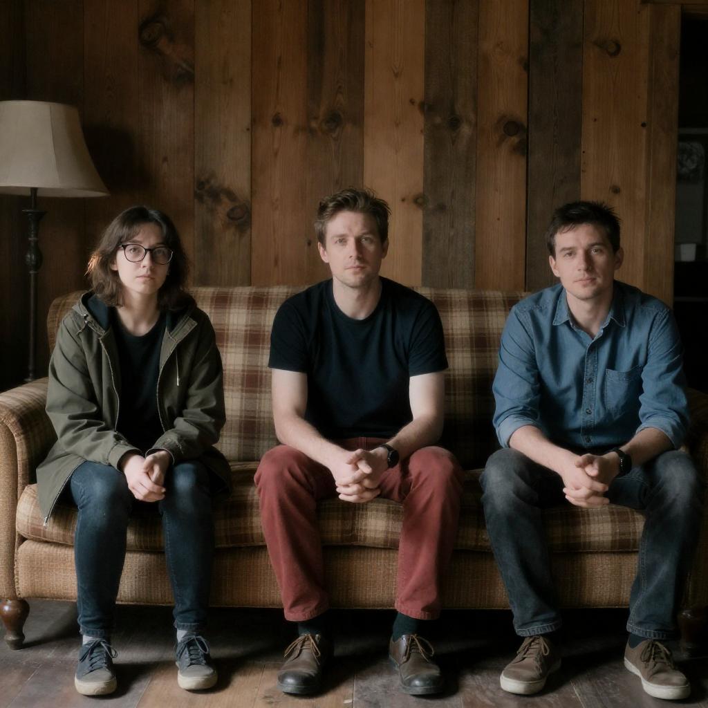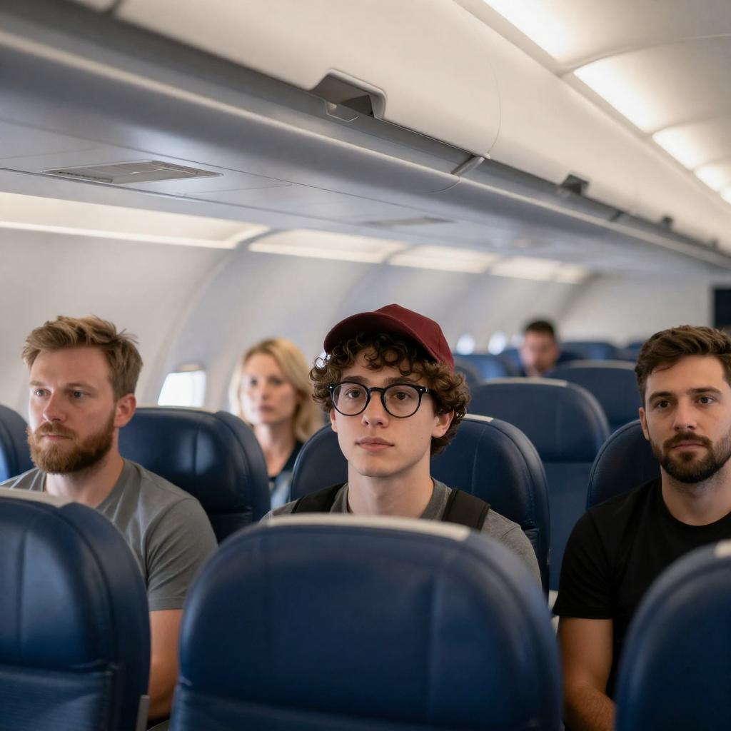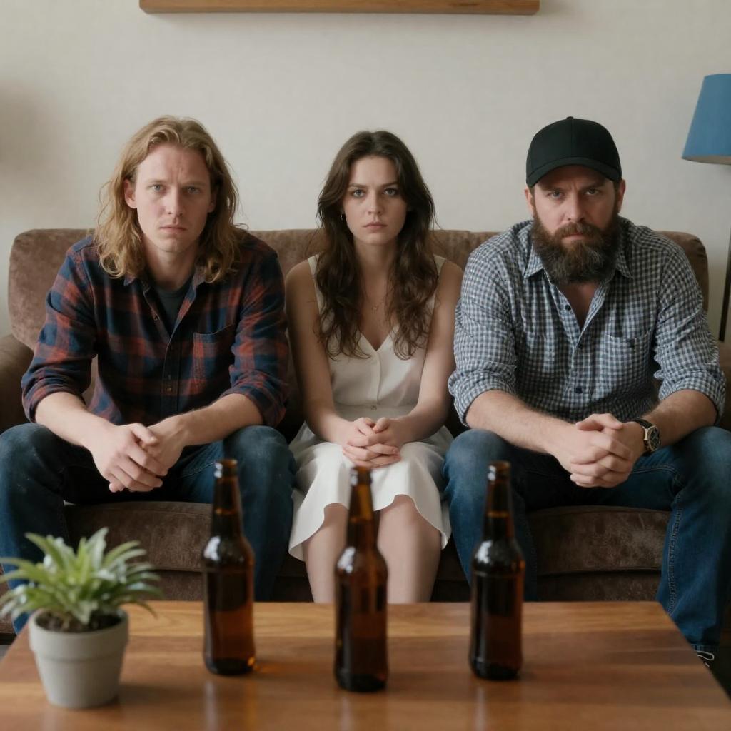 Photograph of three people in a train car. Woman with curly hair, denim shirt, and black pants sits left, holding a drink. Man in red cap and denim jacket sits middle, looking forward. Bearded man in black shirt and gray shorts sits right, looking forward. Blue seats, overhead storage, and a tray table with a cup are visible. All have neutral to serious expressions.
