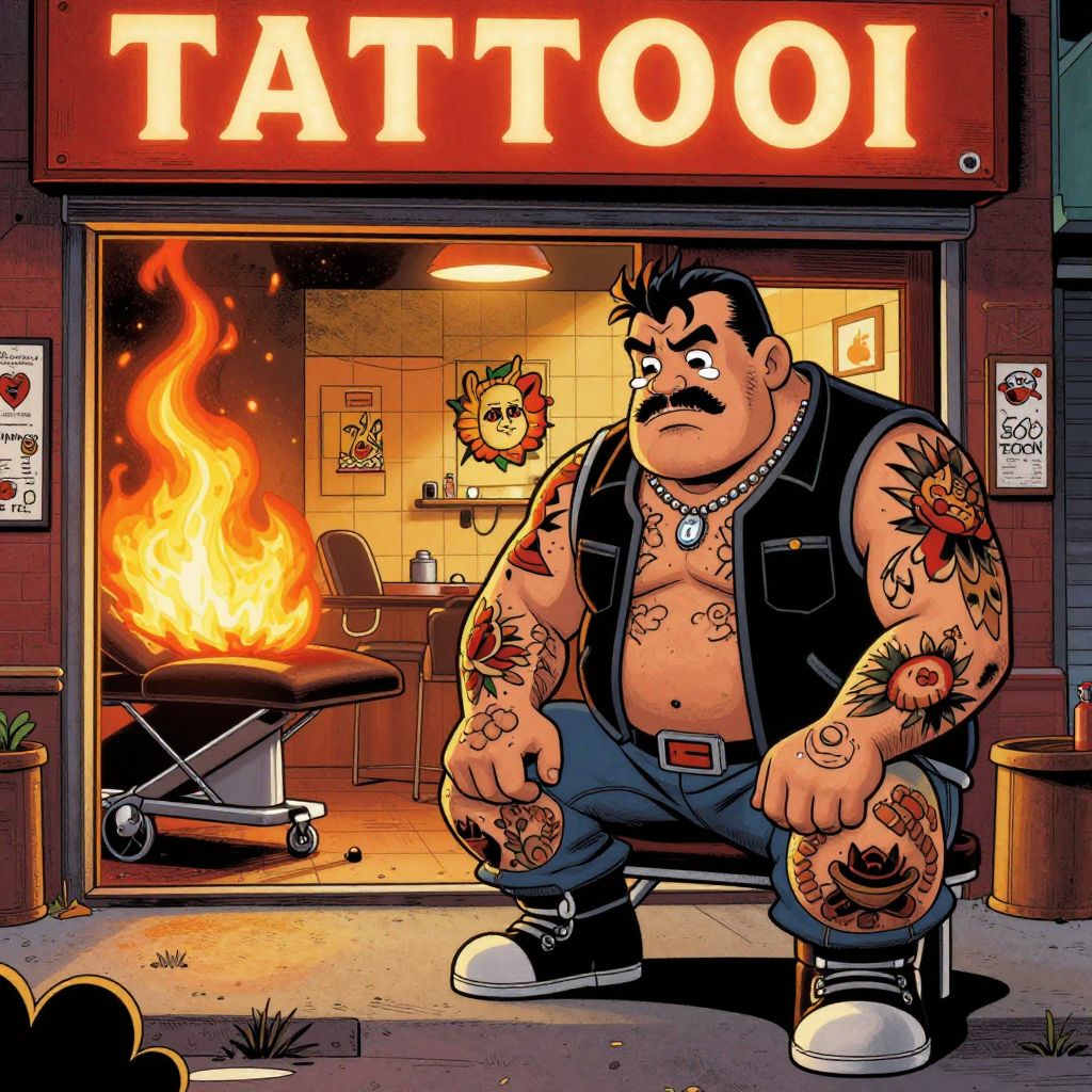 Cartoon tattoo parlor exterior: muscular, tattooed man with black vest, blue jeans, white sneakers, and mustache sits outside fiery tattoo shop