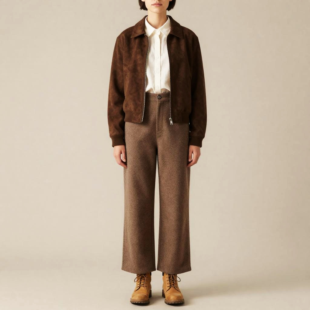 Non-binary youth, Androgynous slender, Short asymmetrical undercut with natural brown, brown pants outfit, earthy brown wide-leg wool trousers with a cropped white linen shirt, chocolate suede bomber jacket, tan lace-up leather boots, documentary natural light