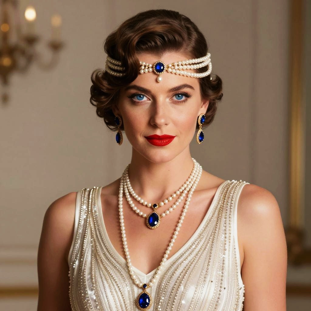 Portrait of a poised woman with striking blue eyes and red lipstick wearing a sparkling white flapper-style dress with intricate beaded details. She accessorizes with vintage pearl and blue gem jewelry, including a multi-strand headband, matching earrings, and a layered necklace, embodying the glamour and elegance of 1920s fashion.
