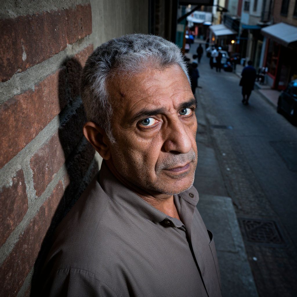 Photograph of a middle-aged Indian man with gray hair and brown shirt, standing against a brick wall on a dimly lit urban street, looking directly