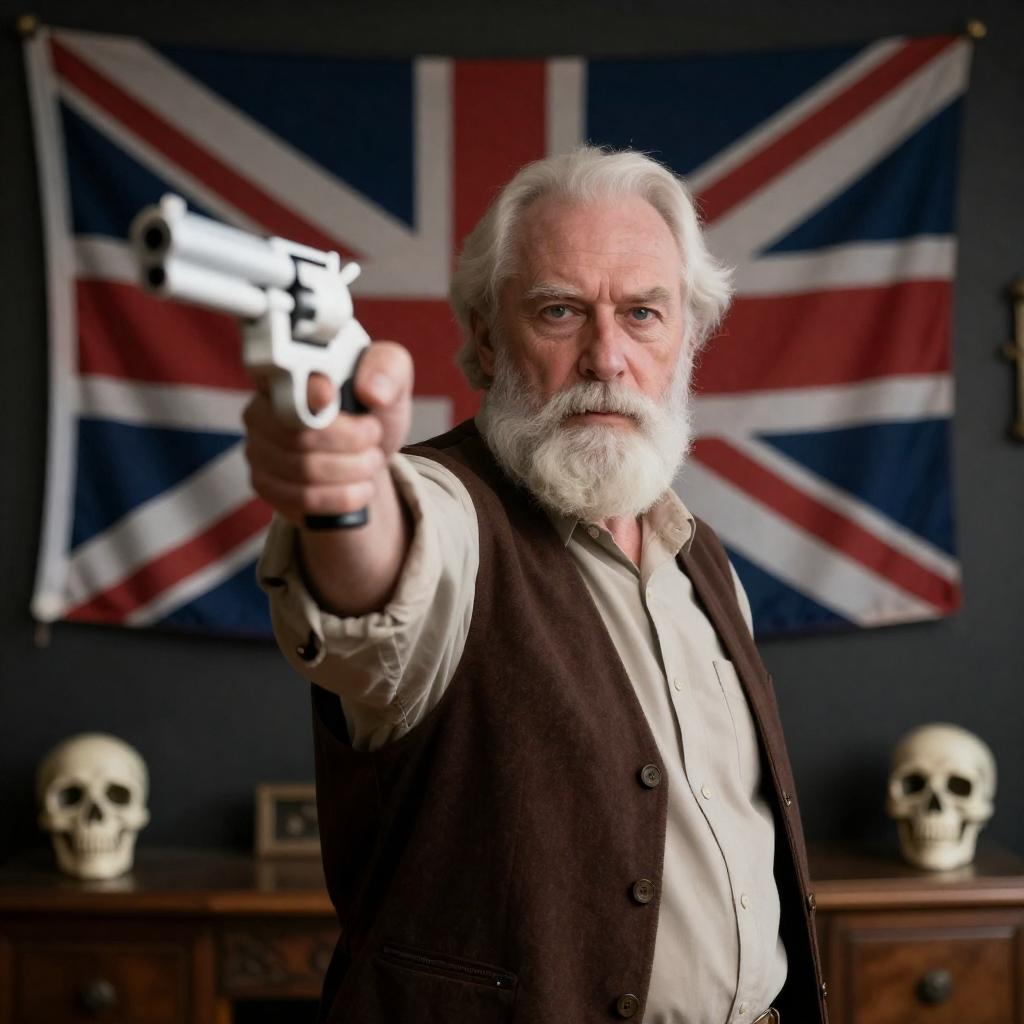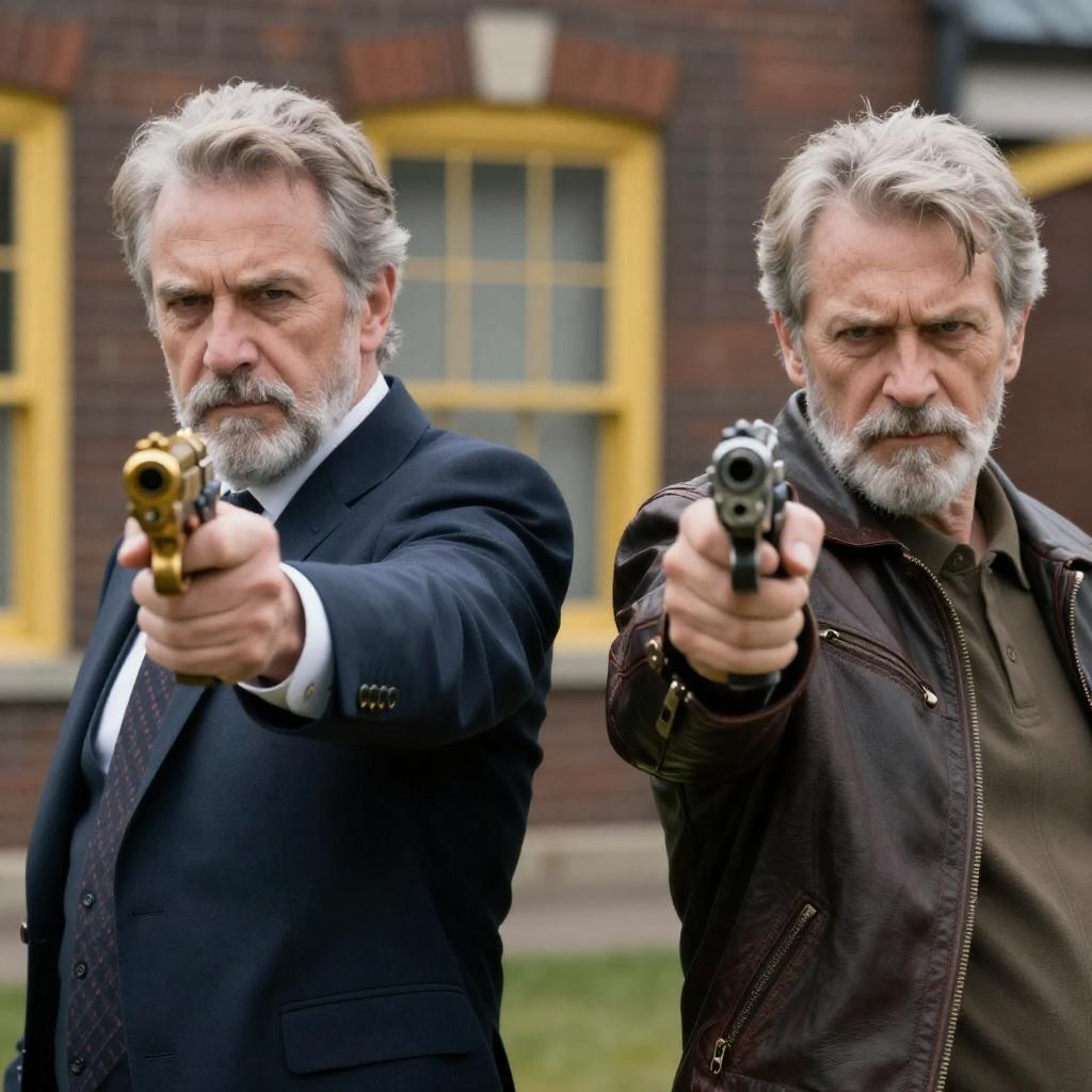 Two serious older men with gray hair and beards are aiming vintage handguns directly at the viewer. The man on the left wears a dark suit and patterned tie, holding a gold handgun. The man on the right wears a brown leather jacket over a polo shirt, aiming a silver handgun. They stand in front of a brick building with yellow-framed windows, outdoors in daylight.
