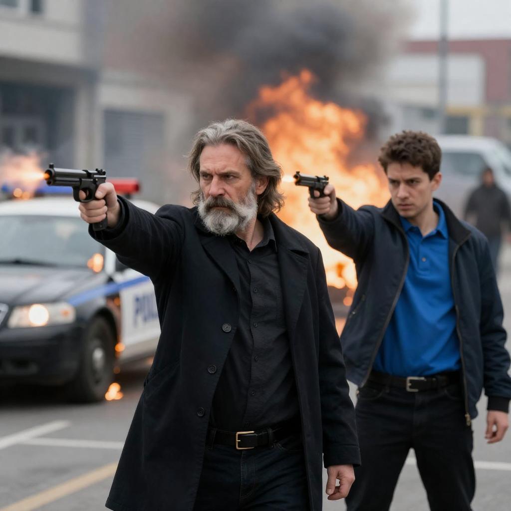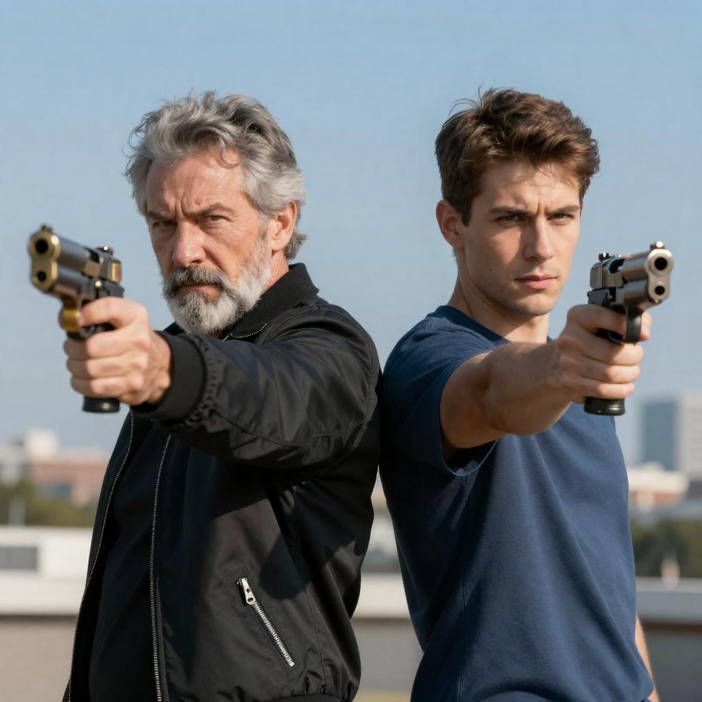 Two older men with gray hair and beards, in dark suits and leather jackets, point vintage gold and silver handguns. The man on the left has a serious expression, while the man on the right looks intense. Background includes a brick building with yellow-framed windows. Both men are in mid-action, aiming at the viewer.