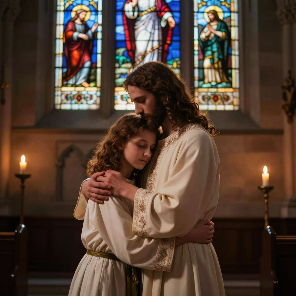 Girl hugging Jesus in a tranquil church setting, stained glass windows casting colorful light on their embrace, intricate details of traditional robes and serene expressions, candlelight flickering softly around, evoking warmth, faith, and divine love in a peaceful, sacred space