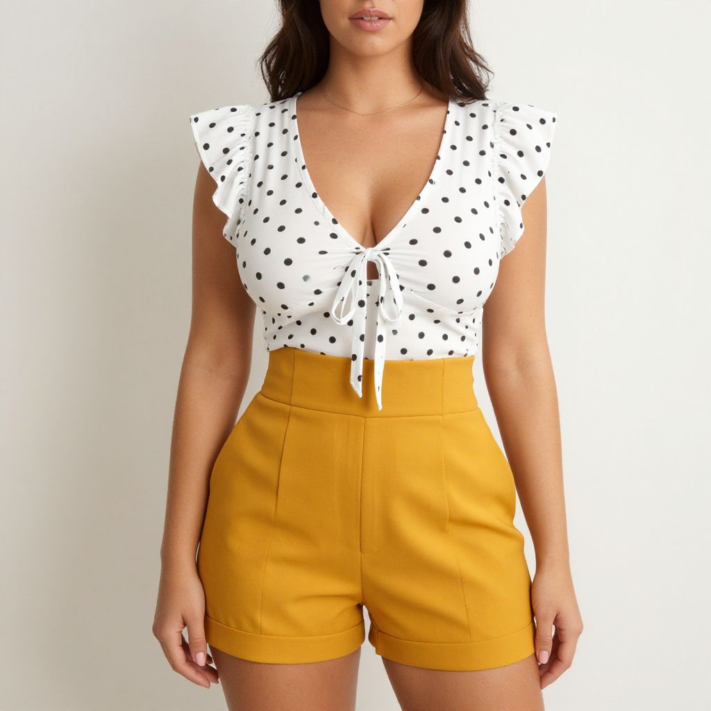"Woman, casual, polka-dotted short sleeve blouse with ruffle details, V-neckline, front tie at waist, white with black dots, paired with high-waisted mustard shorts, tailored fit, knee-length.. Sexy. Pretty face and beаutiful eyes. Big breasts."