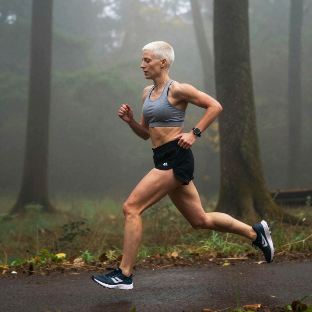 Athletic platinum blonde buzz cut individual running through misty forest at dawn, dynamic movement, soft natural light filtering through trees, sporty apparel
