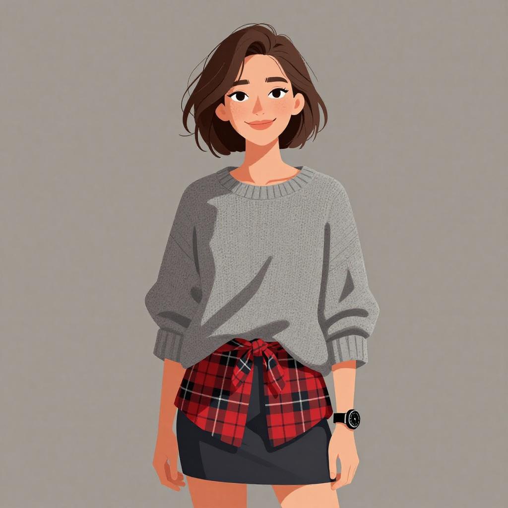 Woman with pretty face and pretty hair. smiling Woman, grunge-inspired, oversized heather grey sweater, textured knit, wide rolled-up sleeves, waist-tied red plaid shirt, dark underlayer skirt peeking out, chunky black wristwatch, casual messy short hair, photo studio background with a muted tone. --sref 1467