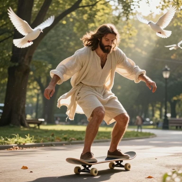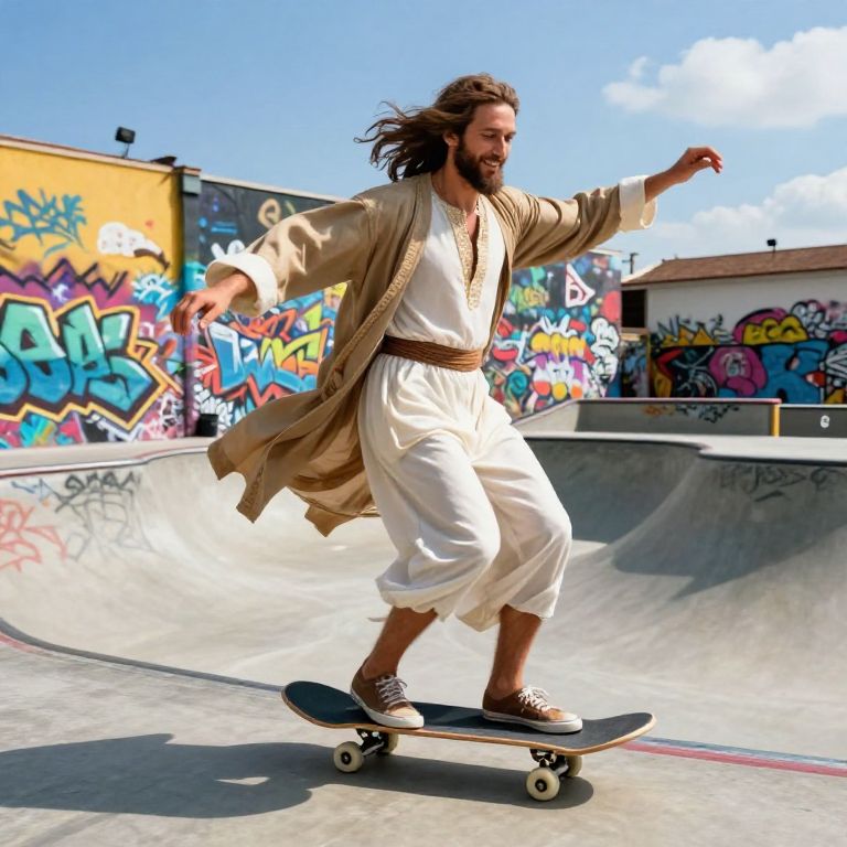 Jesus riding a skateboard through a vibrant urban skatepark, surrounded by colorful graffiti walls under a bright blue sky, wearing traditional robes flowing with the motion, expressive and joyful with an aura of peace, dynamic motion blur effects.