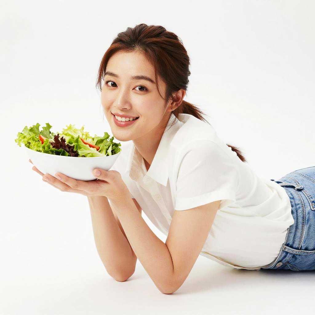 Photograph of an Asian woman with long, dark brown hair and fair skin, smiling warmly at the camera. She is wearing a white sleeveless tank top and holding a yellow bowl filled with assorted fresh fruits, including a pineapple, bananas, oranges, kiwis, a red apple, and green grapes. The background is completely white, making the subject and the colorful fruits stand out prominently. The woman's relaxed and happy expression, combined with the vibrant colors of the fruits, creates a cheerful and healthy atmosphere.