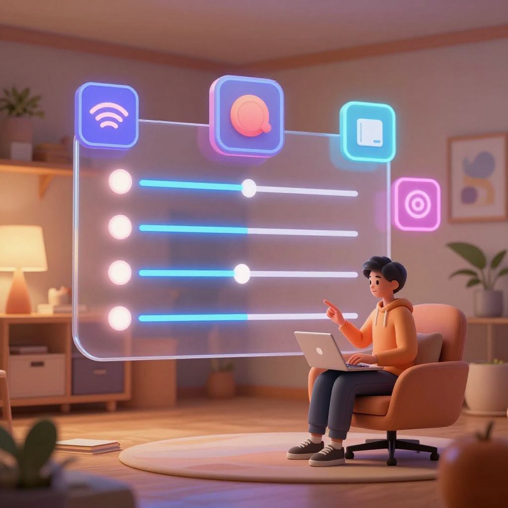 Whimsical digital environment illustrating ComfyUI clip skip functionality, surreal floating icons and sliders suspended mid-air, neon glow effects blending with warm ambient lighting, character calmly interacting with an intuitive UI in a cozy, inviting virtual space