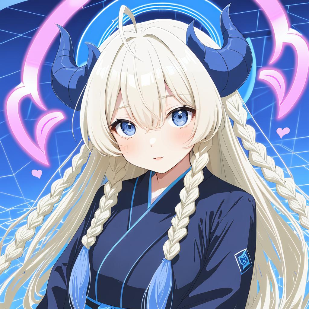 Illustration of an anime-style girl with long braided blonde hair and blue eyes featuring heart-shaped pupils. She wears a dark blue kimono with long sleeves and black gloves. The character has prominent blue demon horns and a glowing blue halo behind her head, set against a futuristic blue background with neon pink accents.