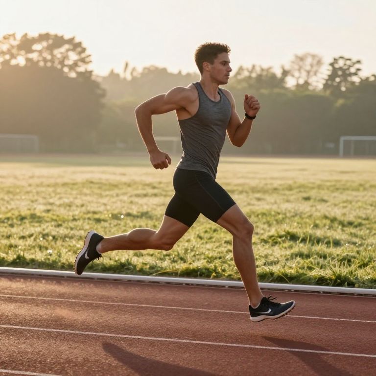 Stocky appearance athlete running quickly on a rural track field during sunrise, wearing fitted sportswear, muscles and strength emphasized, soft warm light casting long shadows, background of trees and dewy grass, photorealistic style with motion blur.