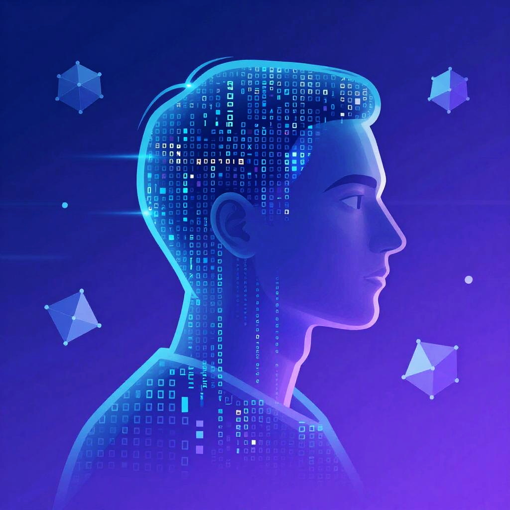 Digital artwork of a glowing blue, tech-savvy profile of a man with binary code filling his head, surrounded by floating geometric shapes against a dark