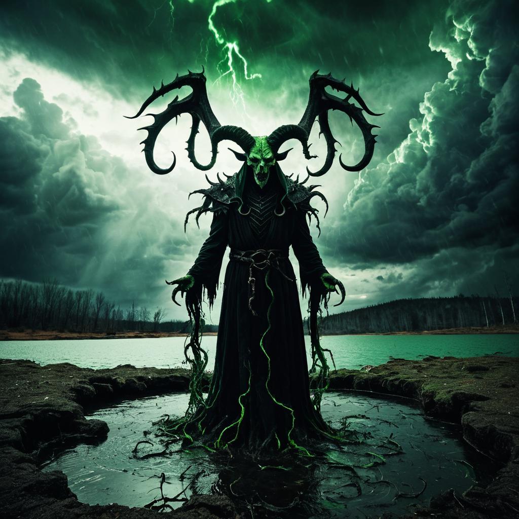 Sorcerer summoning shadowy tendrils from cursed lake under sinister cloud formation, a clash of dark and light, shadowy tendrils, demonic horns, horror, heavy shadows, distorted proportions, ethereal glow, sinister cloud formation, venomous green color, cracked earth, flowing water, fear