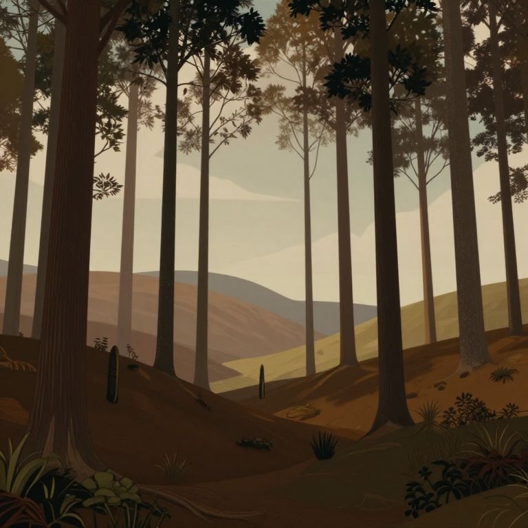 A caricature figure in a whimsical forest of elongated trees and rolling hills, rendered in a dramatic cinematic style with natural earth tones, vibrant color gradients, and meticulous detail, The style is surreal realism with a mid-century modern aesthetic, showcasing layered textures, atmospheric depth, and a fairytale ambiance, Film-like composition and lighting using browns, beiges, and muted colors