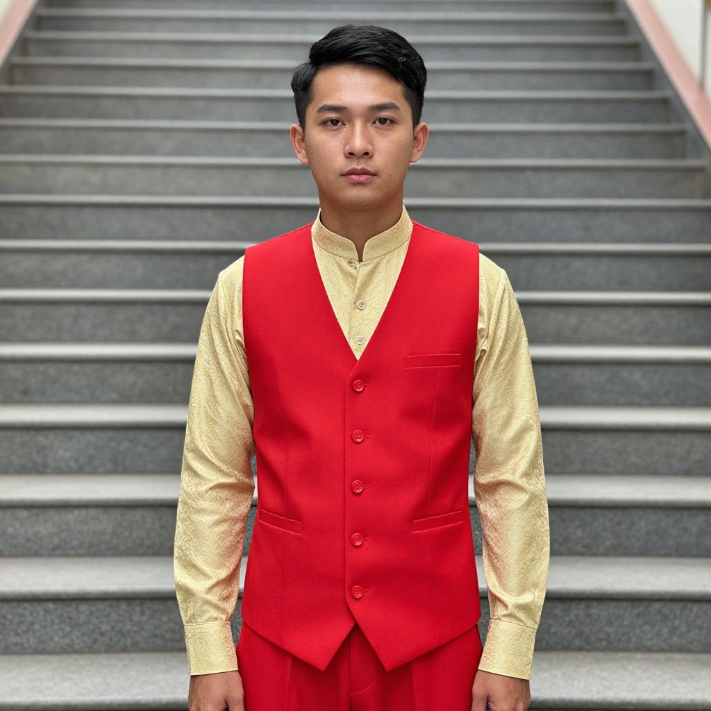 Red Vest Costume, asian man in red vest and gold shirt standing in front of stairs