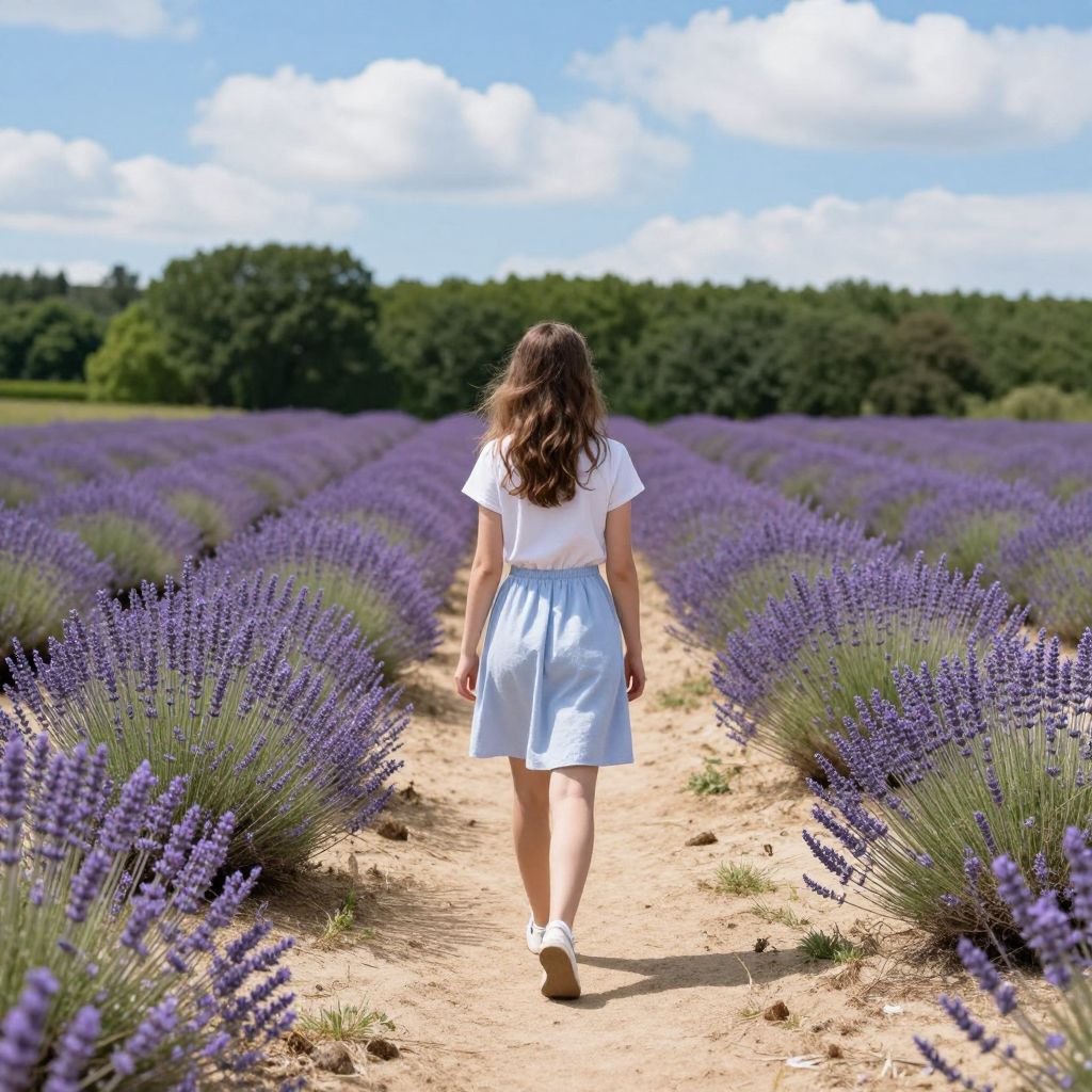 A young woman strolls along a sandy path flanked by rows of vibrant purple lavender, her back turned as she walks toward a serene horizon lined with lush green trees under a bright blue sky dotted with fluffy white clouds.