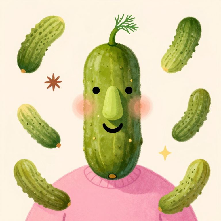 Pickle nose whimsical portrait, a happy figure with a fresh dill pickle for a nose, surrounded by floating pickles and spices, vibrant pastel palette, playful and imaginative style, hand-drawn feel with digital enhancements, cozy background.