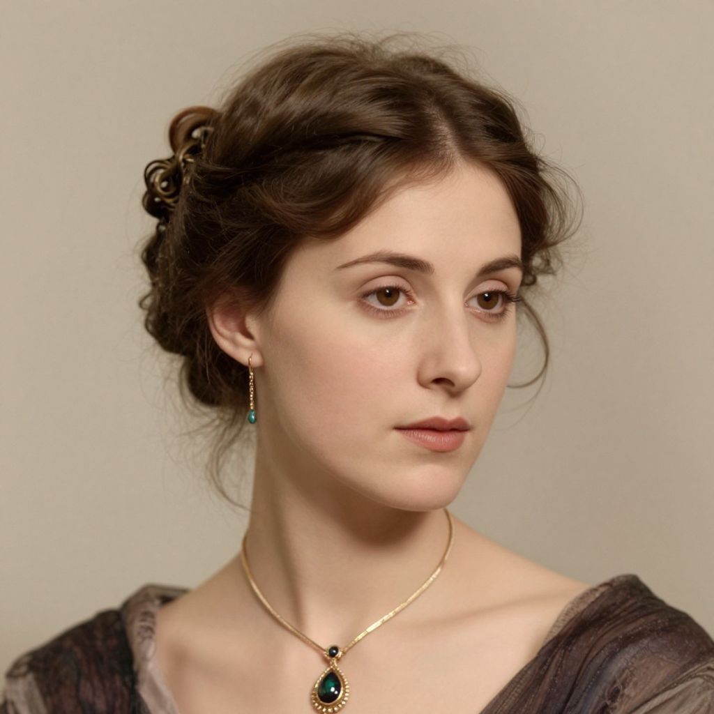 A digital portrait rendered in a vintage, high-definition style, featuring a woman with intricately styled hair and elegant jewelry, evoking the timeless elegance reminiscent of Virginia Woolf's literary aesthetic.