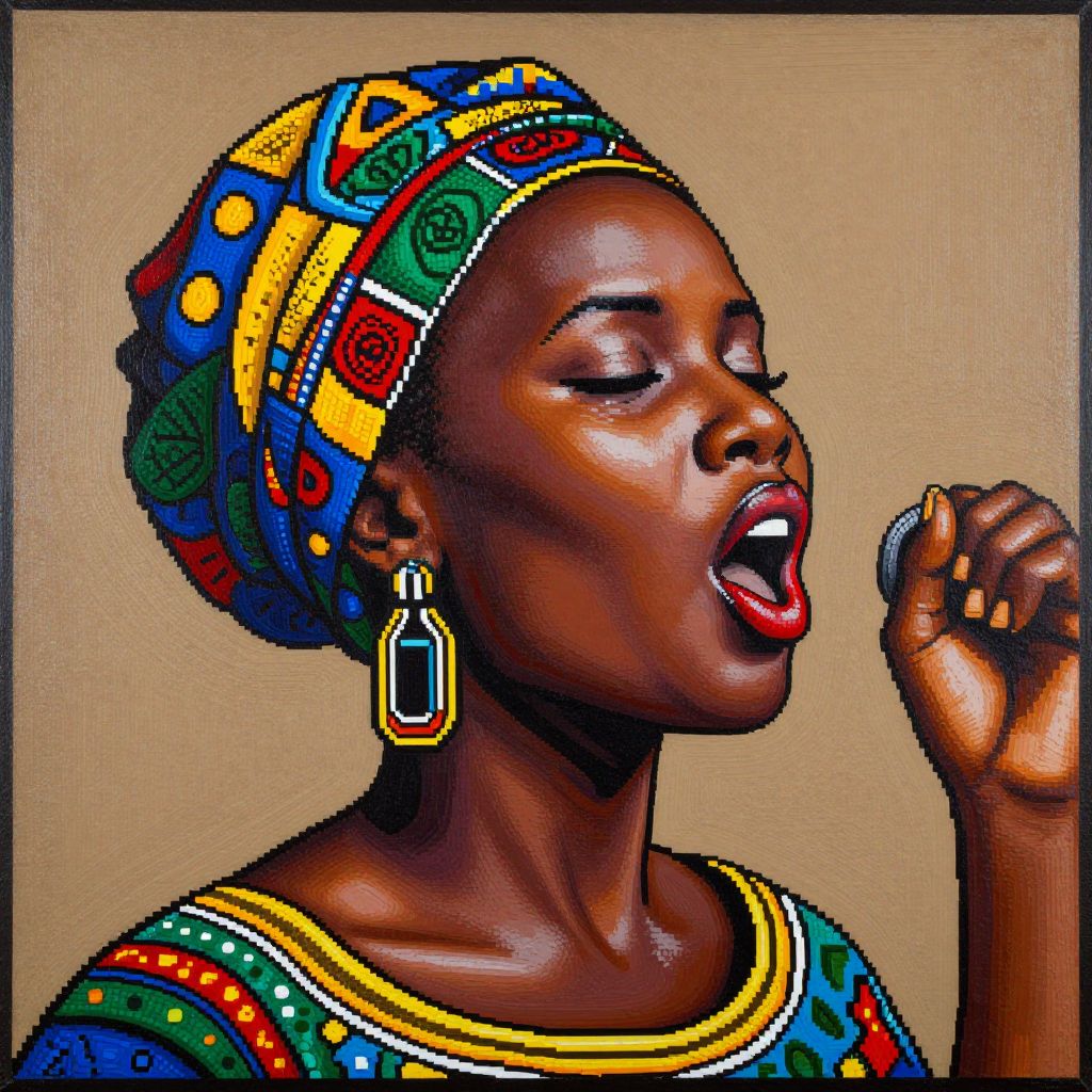 A vibrant African glass painting depicting a woman with a headscarf, evoking the essence of vocal liberation, by artist Benjamin Jean Joseph Constant, with a smooth finish and high pixel detail.