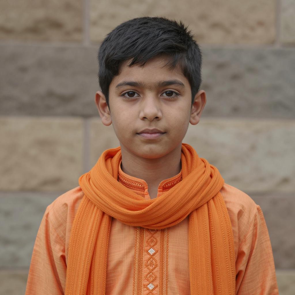 Photorealistic portrait of a young Indian man with medium brown skin, black short hair, brown eyes, and a thin mustache. He has a serious expression and is wearing a grey shirt with a red scarf wrapped around his neck. The background features a blurred ancient stone building with arches under a clear blue sky during daytime, creating a high contrast image with shallow depth of field.