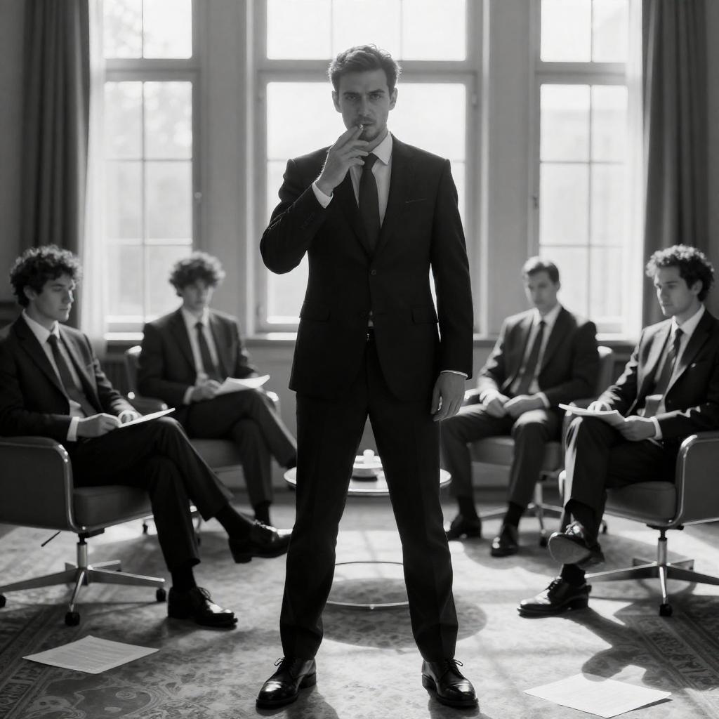 Black-and-white photograph of four men in a sunlit room. Central man in dark suit stands, smoking, facing camera, serious expression. Two men sit on left, one on right, both in dark suits, relaxed. Background includes large windows, patterned carpet, and scattered papers. Sunlight casts shadows on floor.
