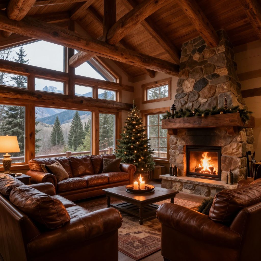 Cozy wooden cabin living room with roaring fireplace, leather sofas, Christmas tree, large windows, wooden ceiling beams, and warm lighting.