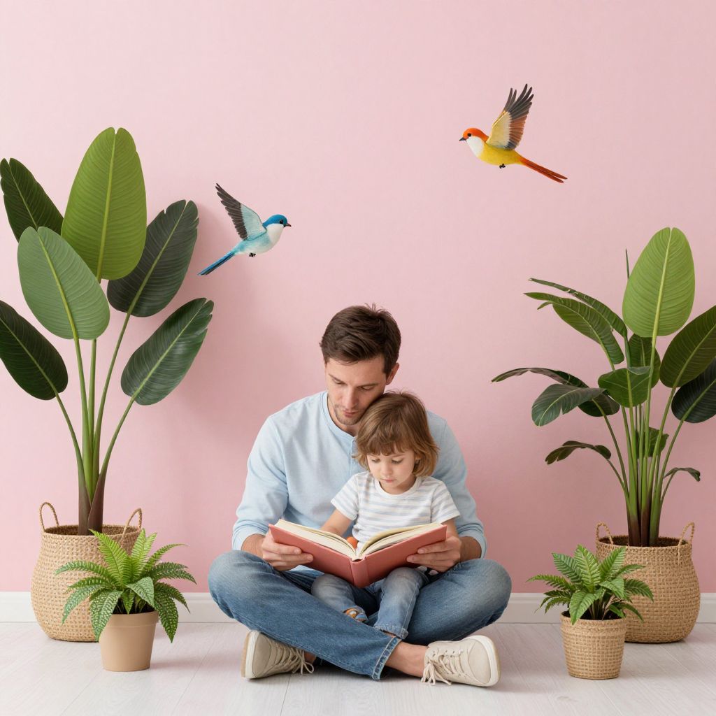 Father with child, reading a book in a minimalist room. maximalist plants and elaborate birds come out of the book. matte matte background in vibrant pastel tones. highly detailed. sharp focus. hd 8x
