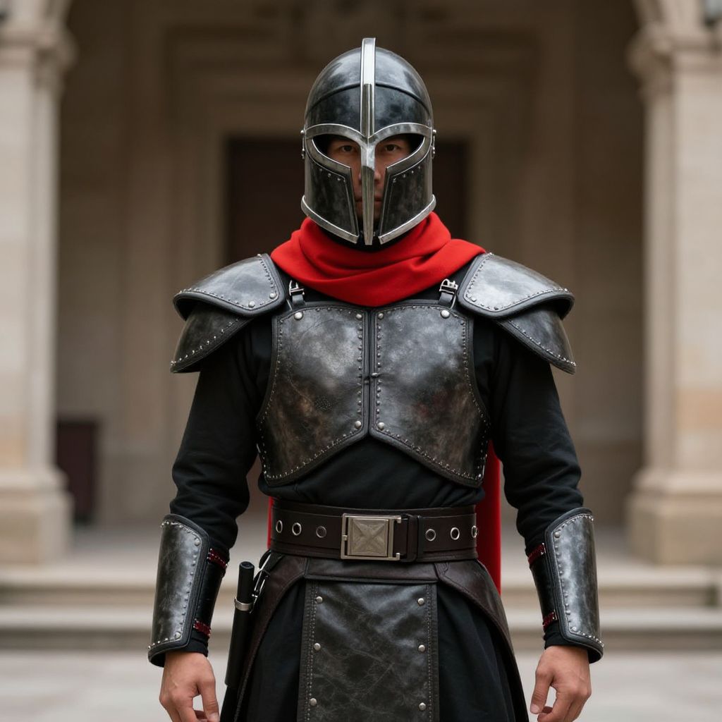 Photograph of a male knight in medieval armor, standing in front of a blurred stone building. He wears a shiny black helmet with a visor, covering his face, and a vibrant red scarf around his neck. His black, leather armor includes pauldrons on the shoulders, a chest plate, and a belt with a square buckle. His black long-sleeve shirt is visible under the armor. The knight's hands rest by his sides, and a small pistol is holstered on his right side. The background features stone columns and a dark doorway. The overall image has a sharp focus on the knight with a soft, blurred background.