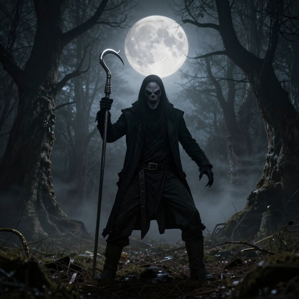 Dark, eerie forest at night, full moon glowing behind, grim reaper-like figure with hooded cloak, skeletal face, holding curved scythe,