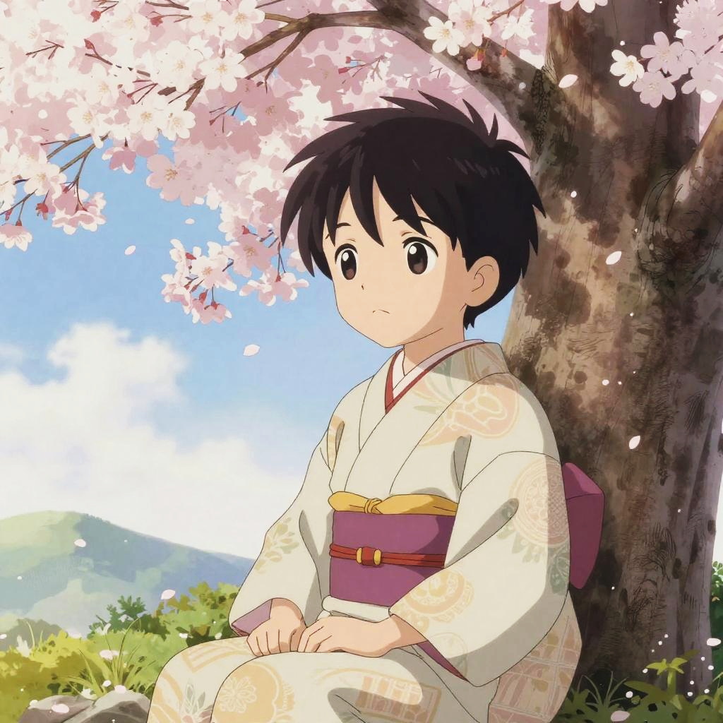 Anime kid black hair, shy expression, sitting under a large sakura tree with petals falling, wearing traditional kimono with intricate patterns, soft pastel colors and delicate brush strokes, classical anime art style with serene atmosphere