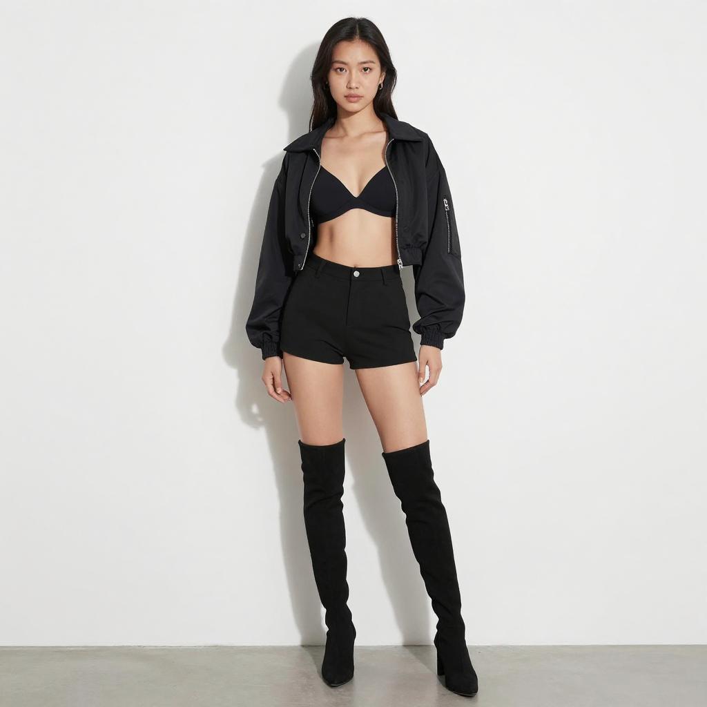 Full-length photo of a confident Asian woman with long black hair wearing a black bra, black cropped jacket, black high-waisted shorts, and black thigh-high boots. She stands against a minimalistic white wall and grey floor background, showcasing a modern and stylish look.
