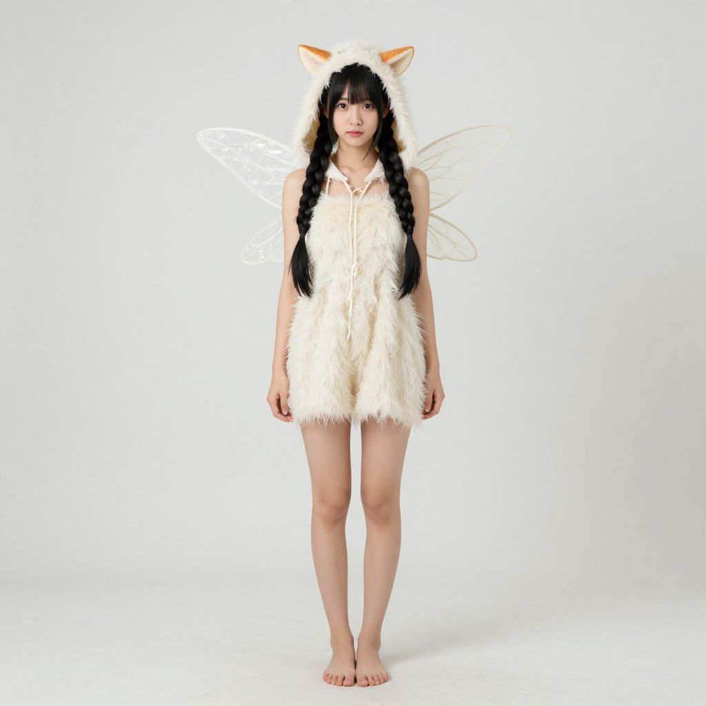 Photograph of a young woman standing against a plain white background. She has long, dark brown hair with bangs and wears a fluffy, white, furry mini-dress that covers her torso and upper thighs. She also has white, translucent fairy wings attached to her back and a headband with orange and white fox ears. She is barefoot and stands with a neutral expression. The overall style is whimsical and fantasy-like, with a soft, playful texture to the furry dress and delicate wings. The lighting is bright and even, highlighting her costume details.