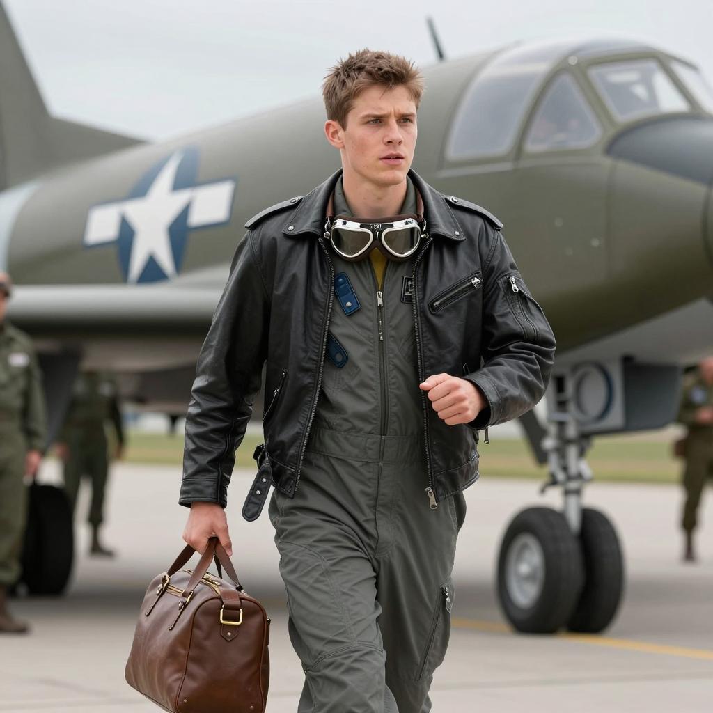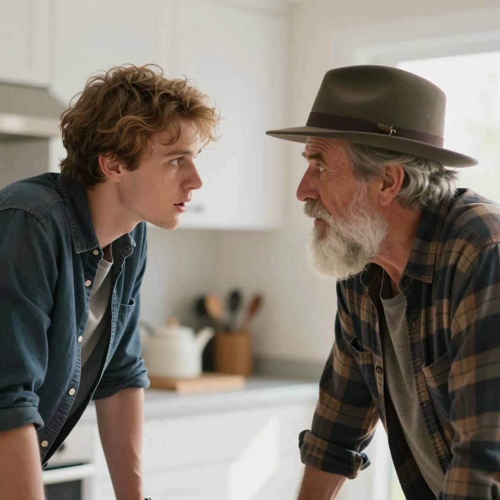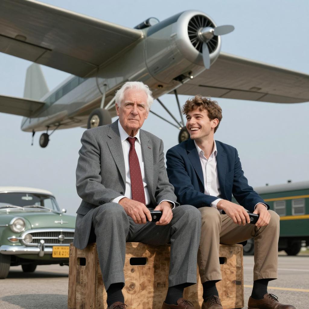 Two men at a wooden table in a hangar. The older man with a mustache, wearing a camouflage jacket and black cap, holds a white mug. The younger man with dark hair, in a black leather jacket, leans forward. A yellow military plane is in the background. The older man looks at the younger man intently. The younger man looks back at the older man.