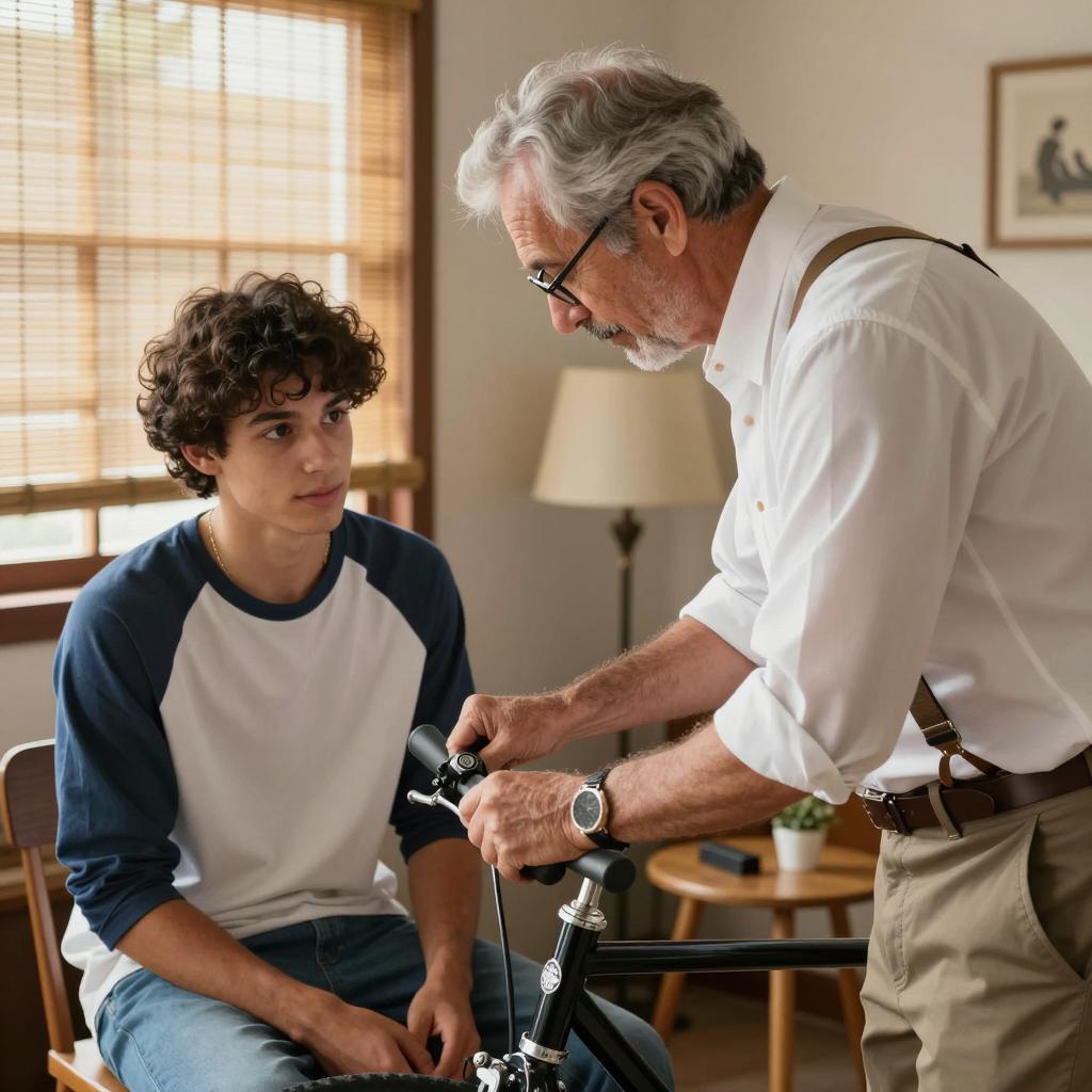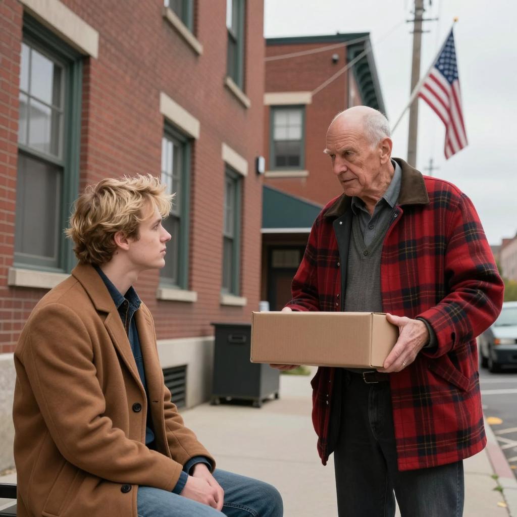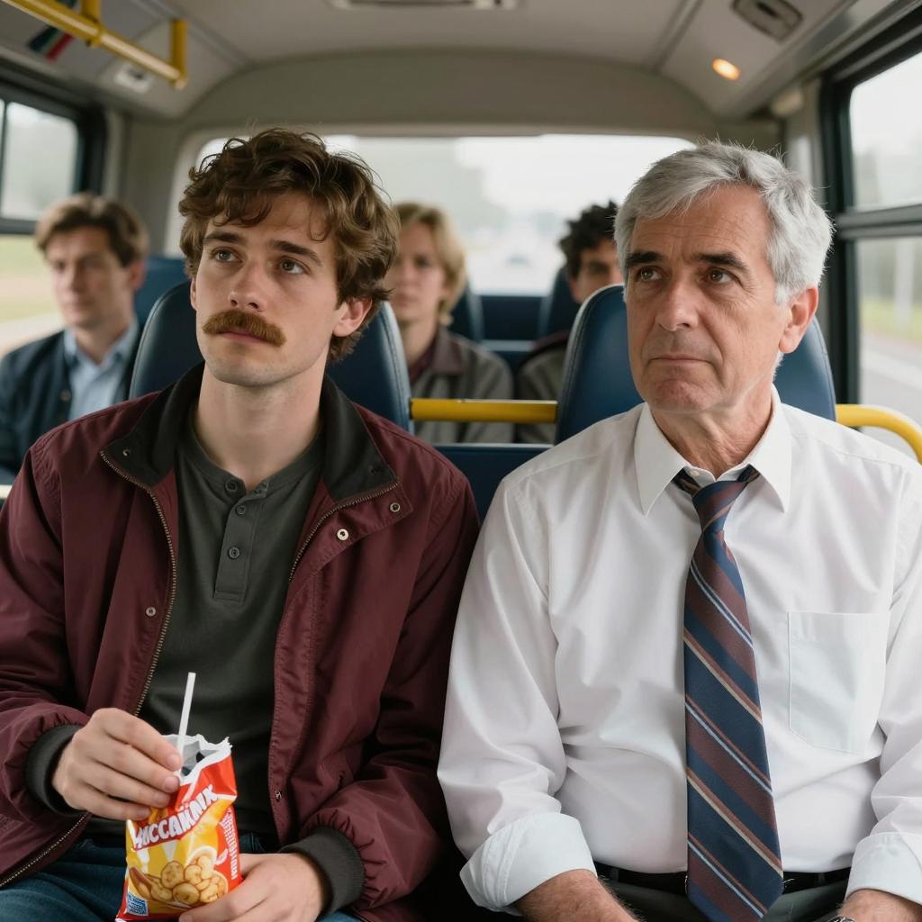 Two men at a wooden table in a hangar. The older man with a mustache, wearing a camouflage jacket and black cap, holds a white mug. The younger man with dark hair, in a black leather jacket, leans forward. A yellow military plane is in the background. The older man looks at the younger man intently. The younger man looks back at the older man.