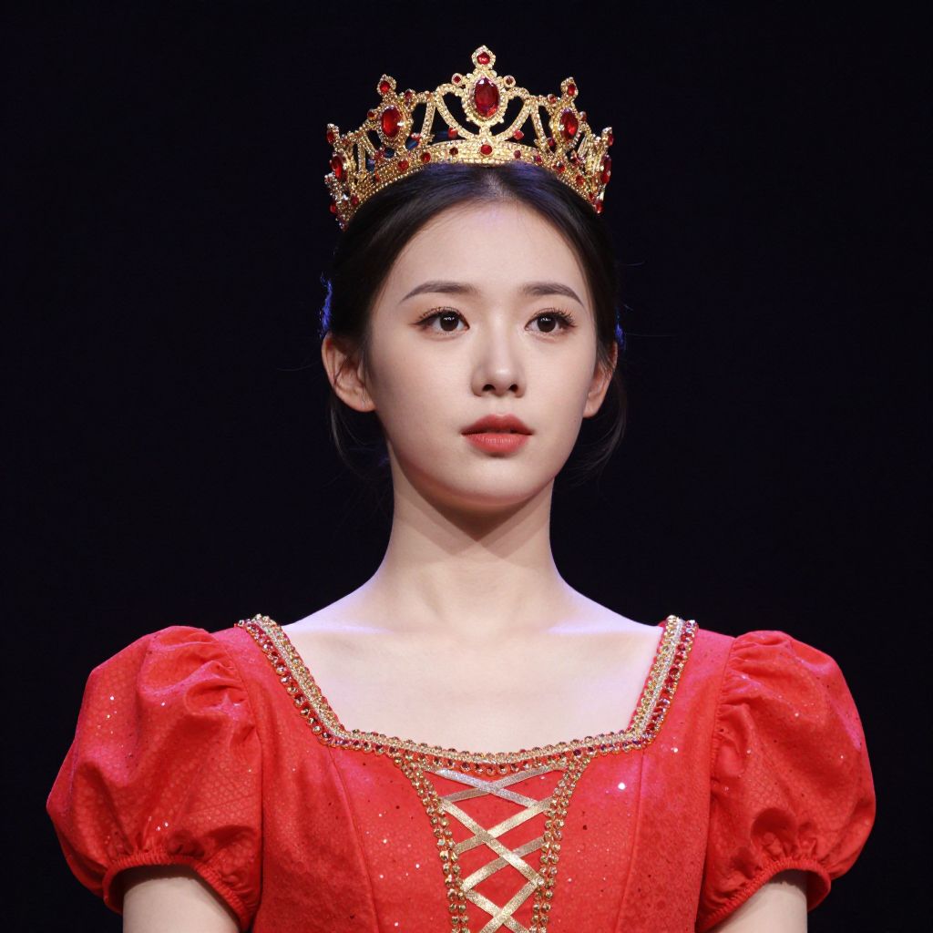 Stage Costume, a close up of a woman in a red dress with a gold crown