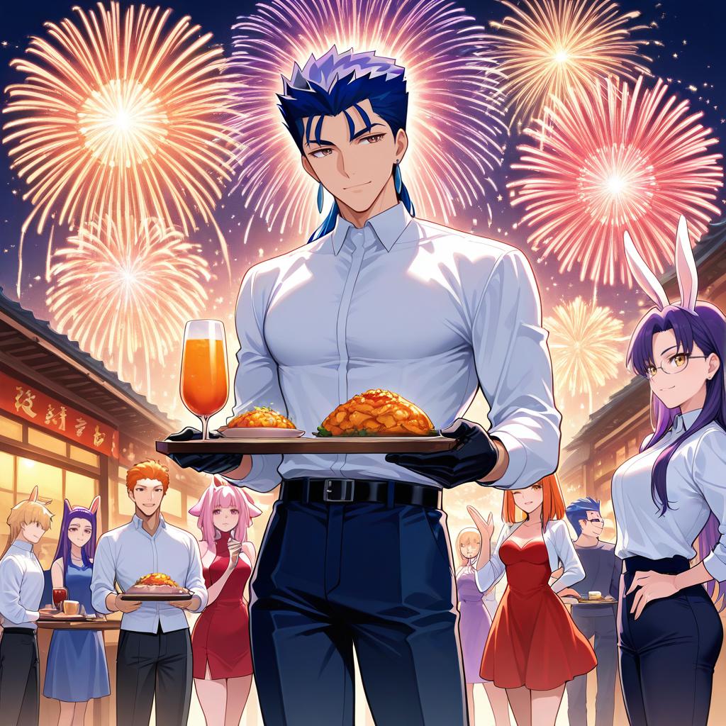 Diarmuid_ua_duibhne_(fate),chibi,lion,multiple boys,food,boned meat,multiple girls,meat