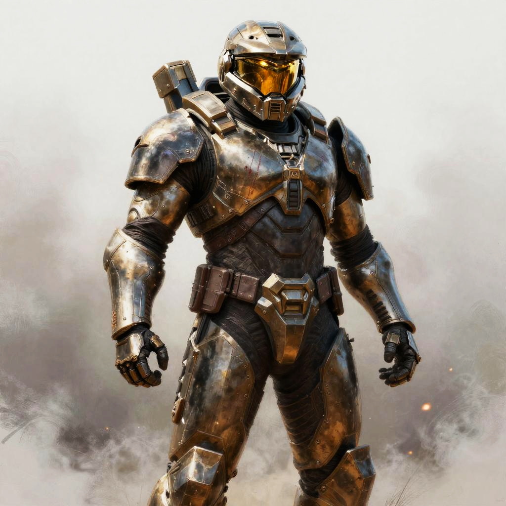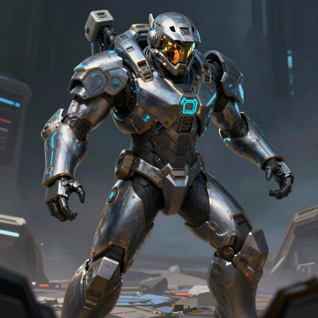 Halo Spartan drawing, highly detailed sketch of a Spartan soldier in Mjolnir armor, powerful stance with a plasma rifle, crisp mechanical details, dramatic lighting emphasizing metallic textures, sci-fi environment with floating holograms and debris swirling.