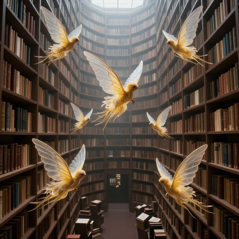 Photograph of a grand library with tall, dark wooden bookshelves filled with books on both sides. Six golden, ethereal birds with translucent white wings are suspended mid-flight, evenly spaced throughout the central aisle. The birds' feathers glow softly, contrasting with the dimly lit, shadowy background. The aisle is lined with neatly stacked books, leading to a distant, illuminated skylight at the far end, casting a bright light that enhances the mystical atmosphere. The image combines realism with a touch of fantasy, creating a dreamlike, otherworldly scene.