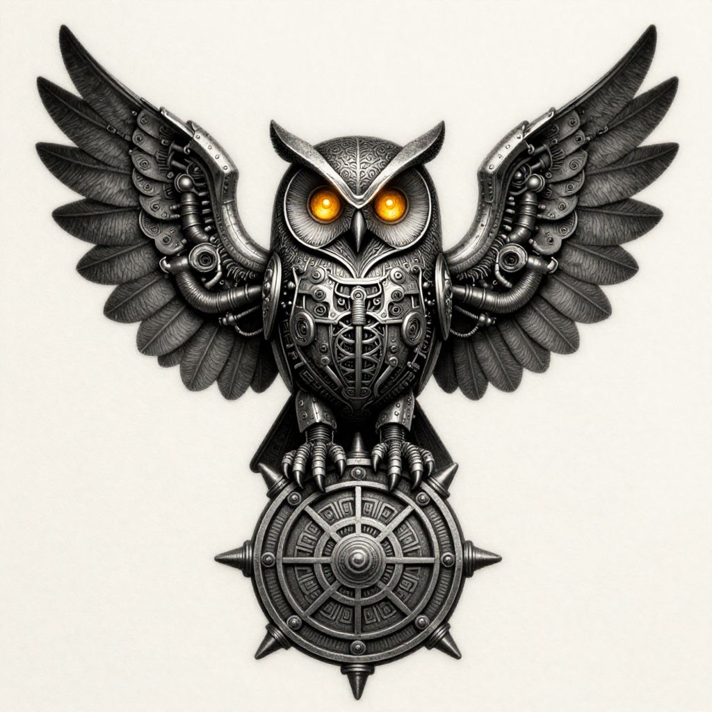 Digital drawing of a mechanical owl with black, intricately detailed feathers and wings spread wide. The owl's eyes glow bright orange, creating a striking contrast against its metallic, steampunk-inspired body. The owl's chest features a complex, gear-like pattern, and it stands on a large, circular, spiked shield with radial lines. The background is pure white, emphasizing the owl's dark, textured form. The overall style is a fusion of steampunk and fantasy, with a focus on mechanical and industrial elements.