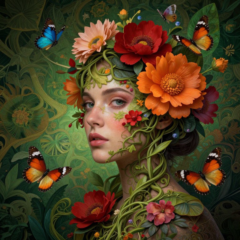 The image is a highly detailed and intricate illustration of a woman, seemingly in an astral projection, surrounded by a lush, vibrant environment. Her face is adorned with a myriad of vivid flowers, including red and orange blooms, and delicate green vines that intertwine with her features. Butterflies of various colors, including blue and orange, flutter around her, adding to the ethereal atmosphere. The background is a rich tapestry of greenery, with large leaves and intricate floral patterns, creating a sense of depth and immersion. The overall composition is dynamic, with elements arranged in a way that draws the viewer's eye across the image, from the woman's face to the surrounding flora. The colors are vivid and well-balanced, with a strong contrast between the green tones of the background and the more saturated hues of the flowers and butterflies. The textures are hyperrealistic, from the smooth skin of the woman to the delicate petals of the flowers and the roughness of the leaves. The lighting is soft yet dramatic, with a mix of natural and artificial sources that highlight the intricate details and create a sense of depth. The image is a beautiful representation of the interplay between human and nature, captured with a high level of realism and artistic skill.