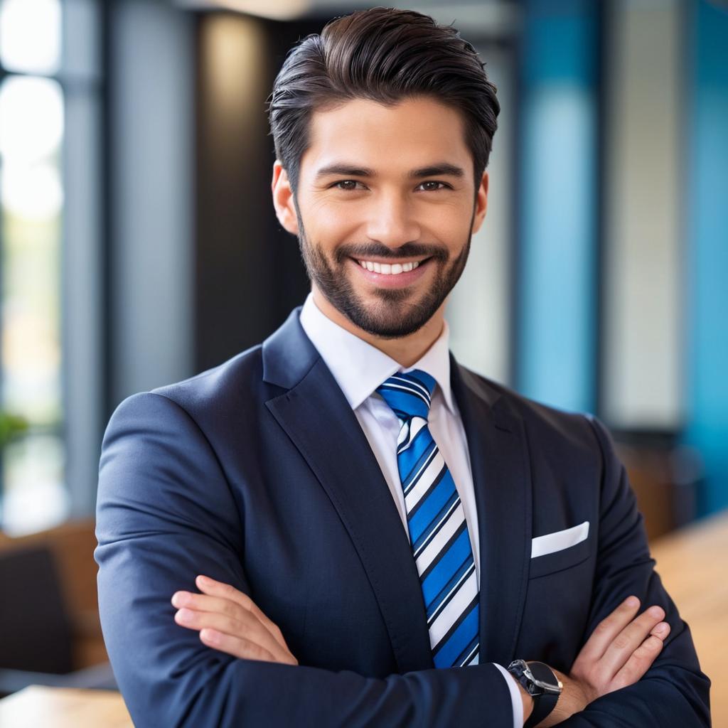 Portrait of a confident young businessman smiling, wearing a dark navy suit and a blue striped tie. He has well-groomed dark hair and beard, standing outdoors with a modern office building in the background.