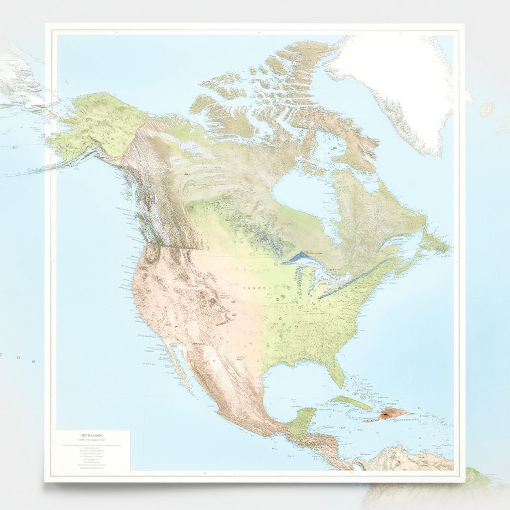 North America labeled map, detailed vintage style, soft pastel color palette, clear typography marking countries and major cities, topographical features like mountains and rivers, subtle textures, elegant cartographic design, high resolution, studio lighting