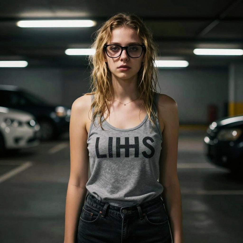 Photograph of a young woman with wet, blonde, shoulder-length hair standing in a dimly lit parking garage. She wears black-rimmed glasses, a gray tank top with "LIHS" in bold black letters, and high-waisted dark jeans. The background shows blurred cars and fluorescent lights on the ceiling. Her expression is neutral, and the overall lighting creates a moody, slightly dramatic atmosphere. The parking garage has a dark, industrial feel with visible yellow parking lines. The image has a shallow depth of field, focusing on the woman while blurring the background.