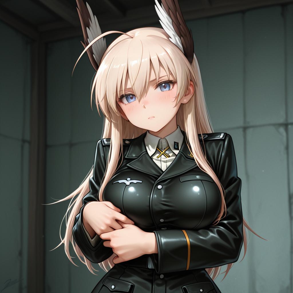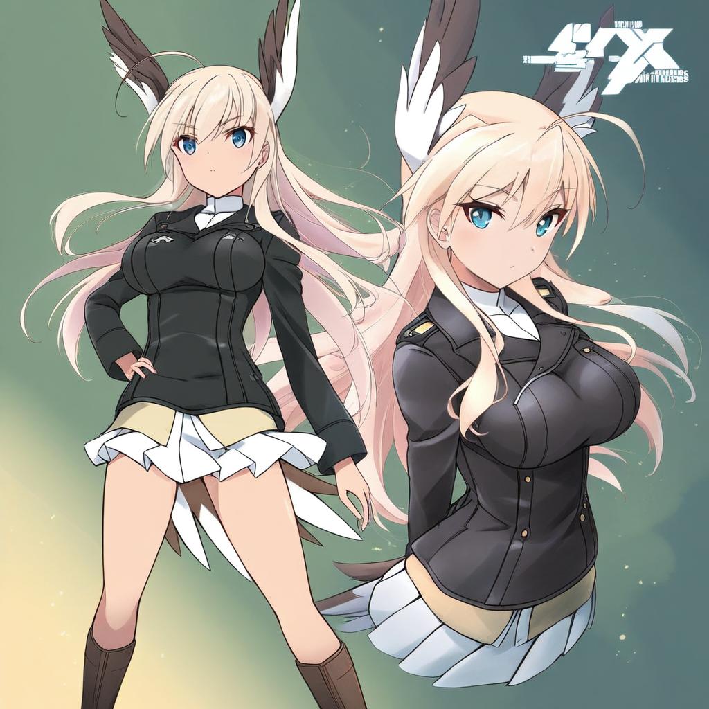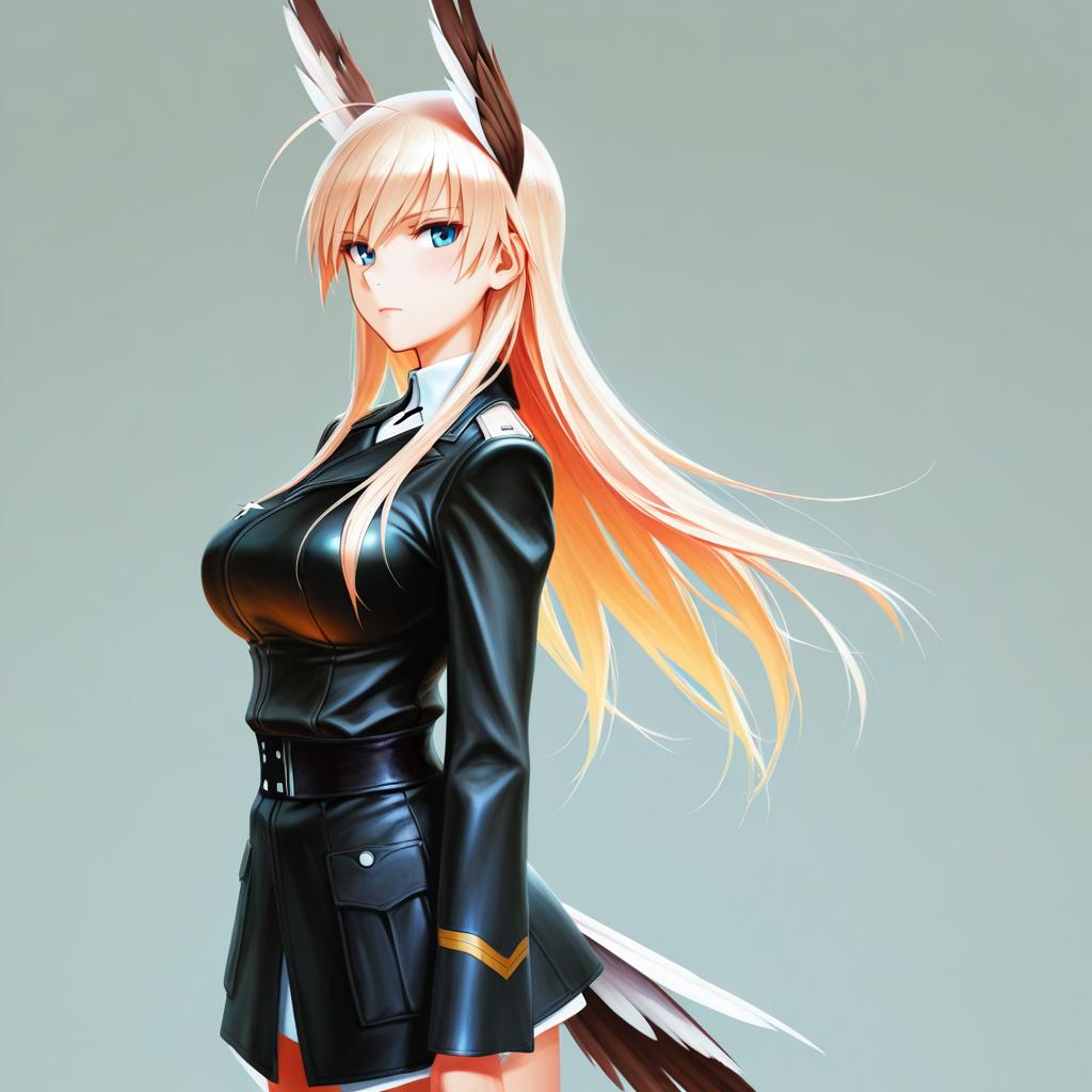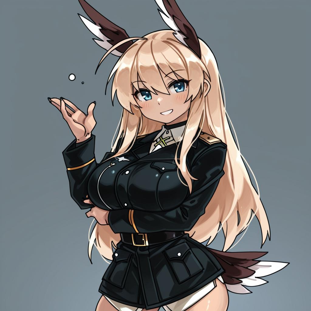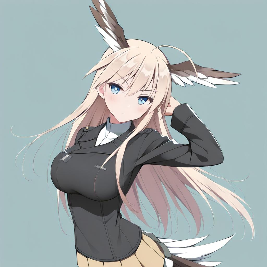 Hanna-justina marseille, world witches series, 1girl, bird girl, bird tail, blue eyes, long hair, blonde hair, ahoge, large breasts, military uniform, head wings, by artist kamu (geeenius), animagine