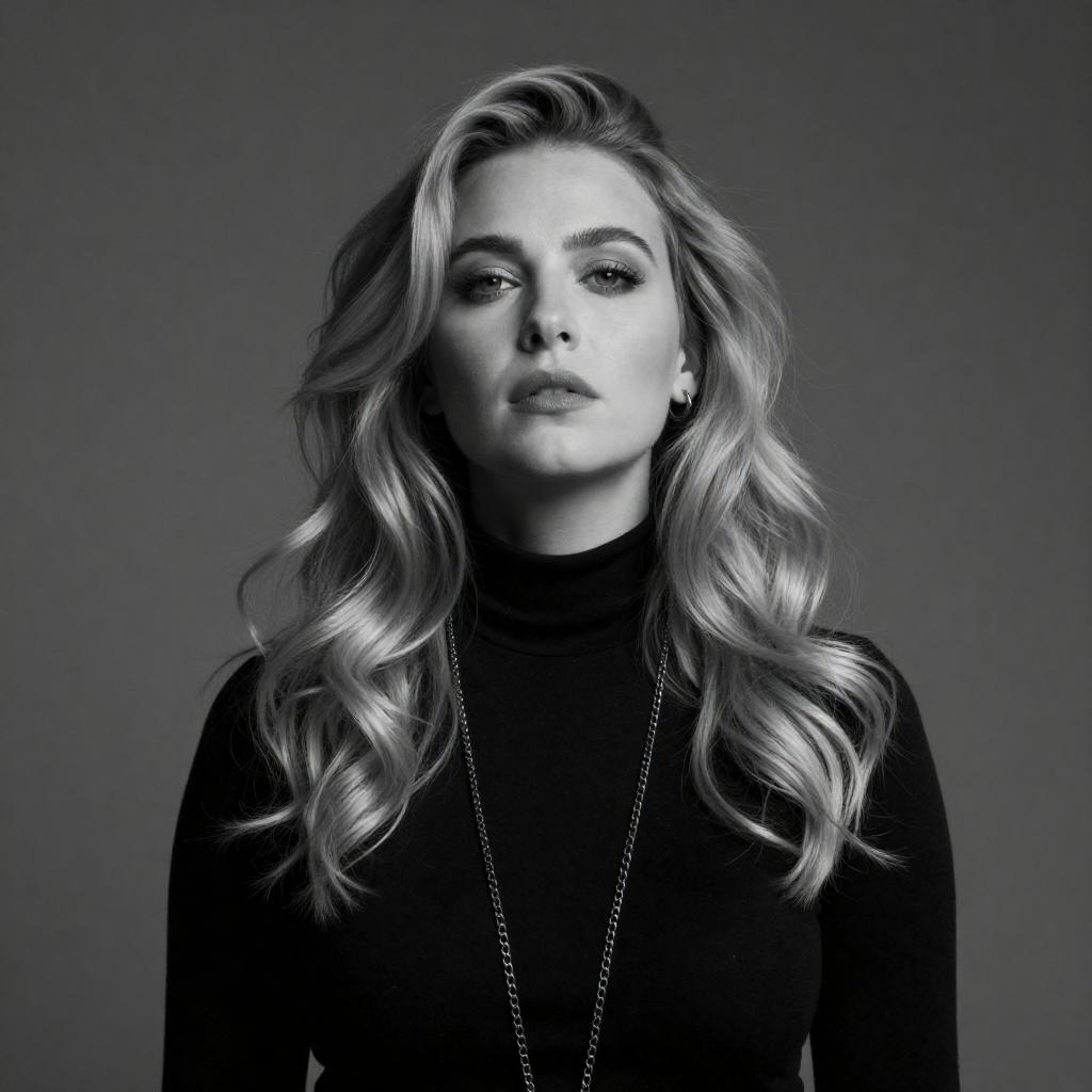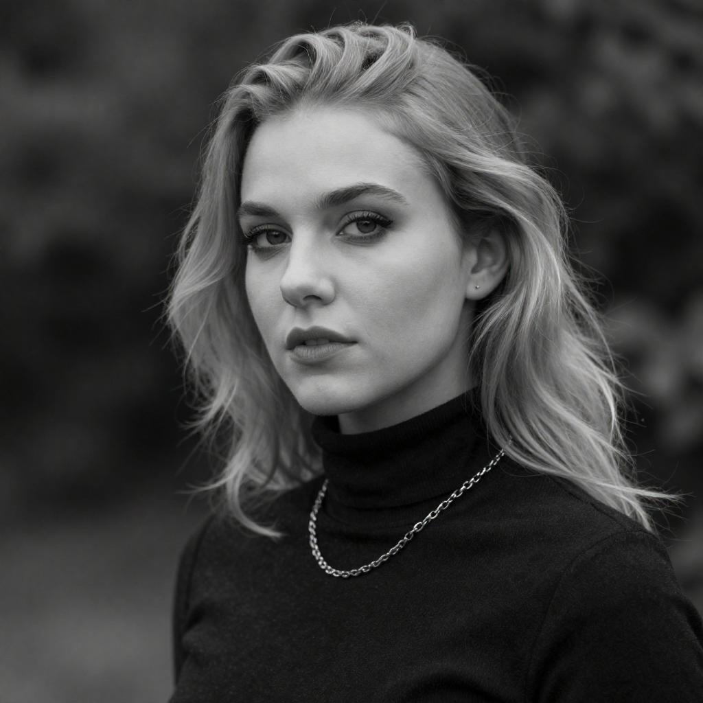 Black-and-white photograph of a blonde woman with voluminous, wavy hair and heavy eyeliner, gazing to the side. She wears a dark, shiny jacket with a white collar. The ured, rocky background contrasts with her smooth skin and glossy hair. Her expression is pensive and slightly melancholic.
