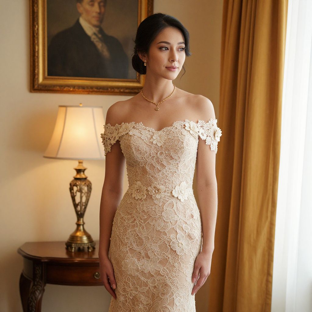 Elegant woman wearing a delicate off-the-shoulder lace dress adorned with floral embellishments, complemented by a gold necklace, stands gracefully in a warmly lit room featuring a framed portrait above a wooden table lamp and soft orange curtains draped over a window.