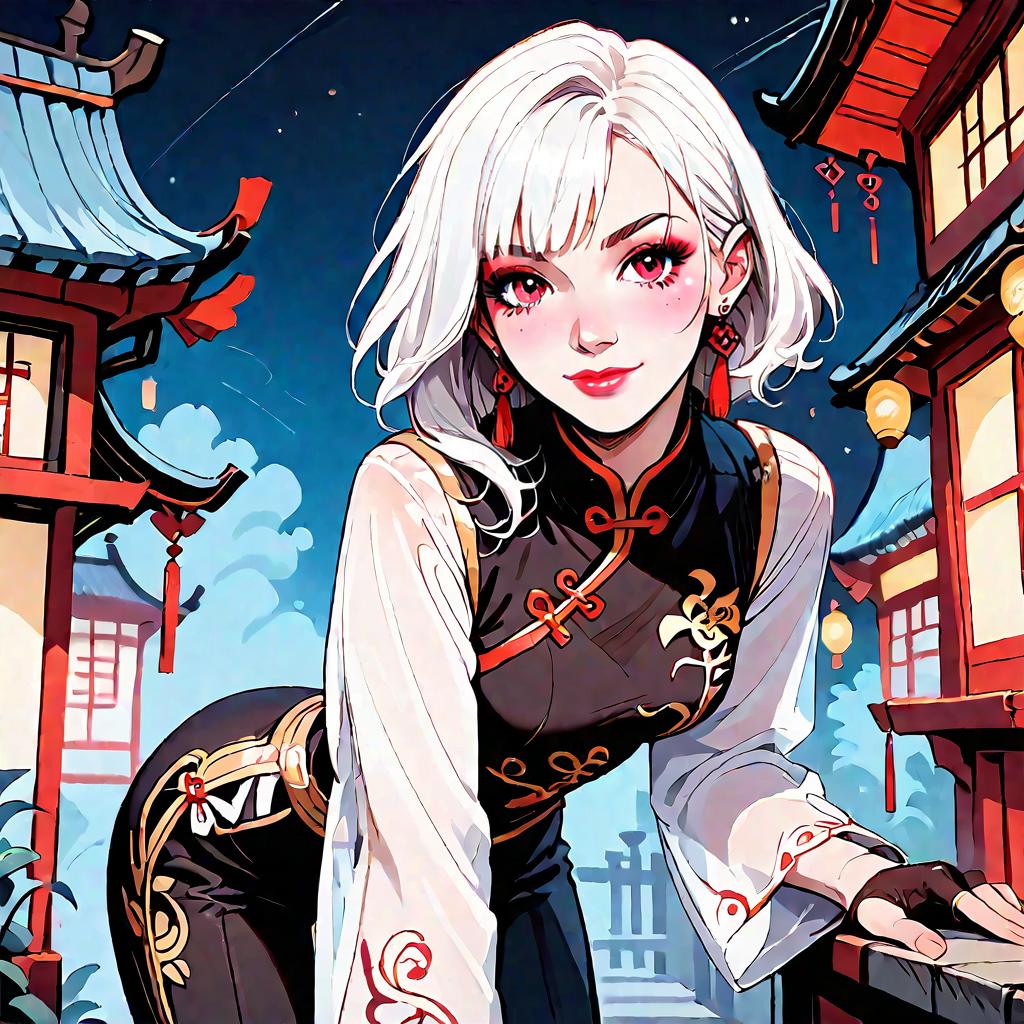 Anime Style Girl in Black Chinese Outfit at Night