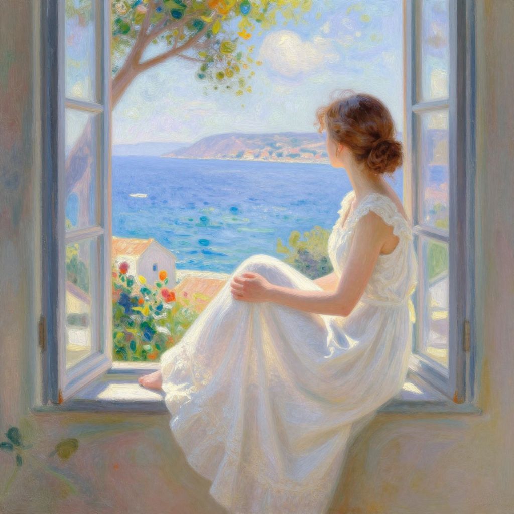 A serene digital illustration captures a woman in a flowing white dress sitting by an open window, gazing out at a picturesque coastal view reminiscent of Renoir's impressionistic style, with vibrant hues and soft lighting enhancing the tranquil ambiance.