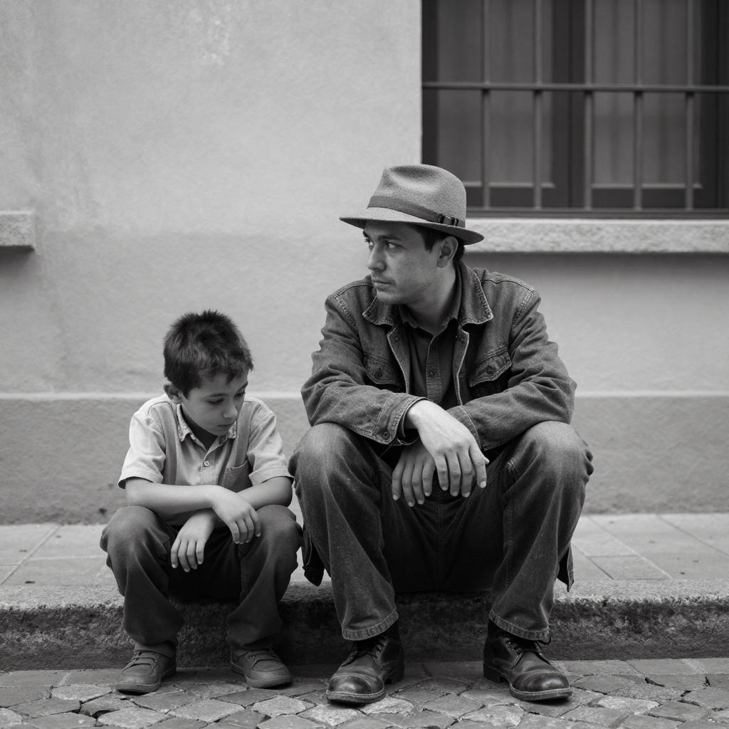Black-and-white photograph of an adult man and a young girl on a sidewalk. Man in long coat, hat, and gloves, holding cane, looking down at girl with short hair, wearing dress and holding cane. Street lamp on left, ured wall in background. Man's hands on cane, girl looking up at him.